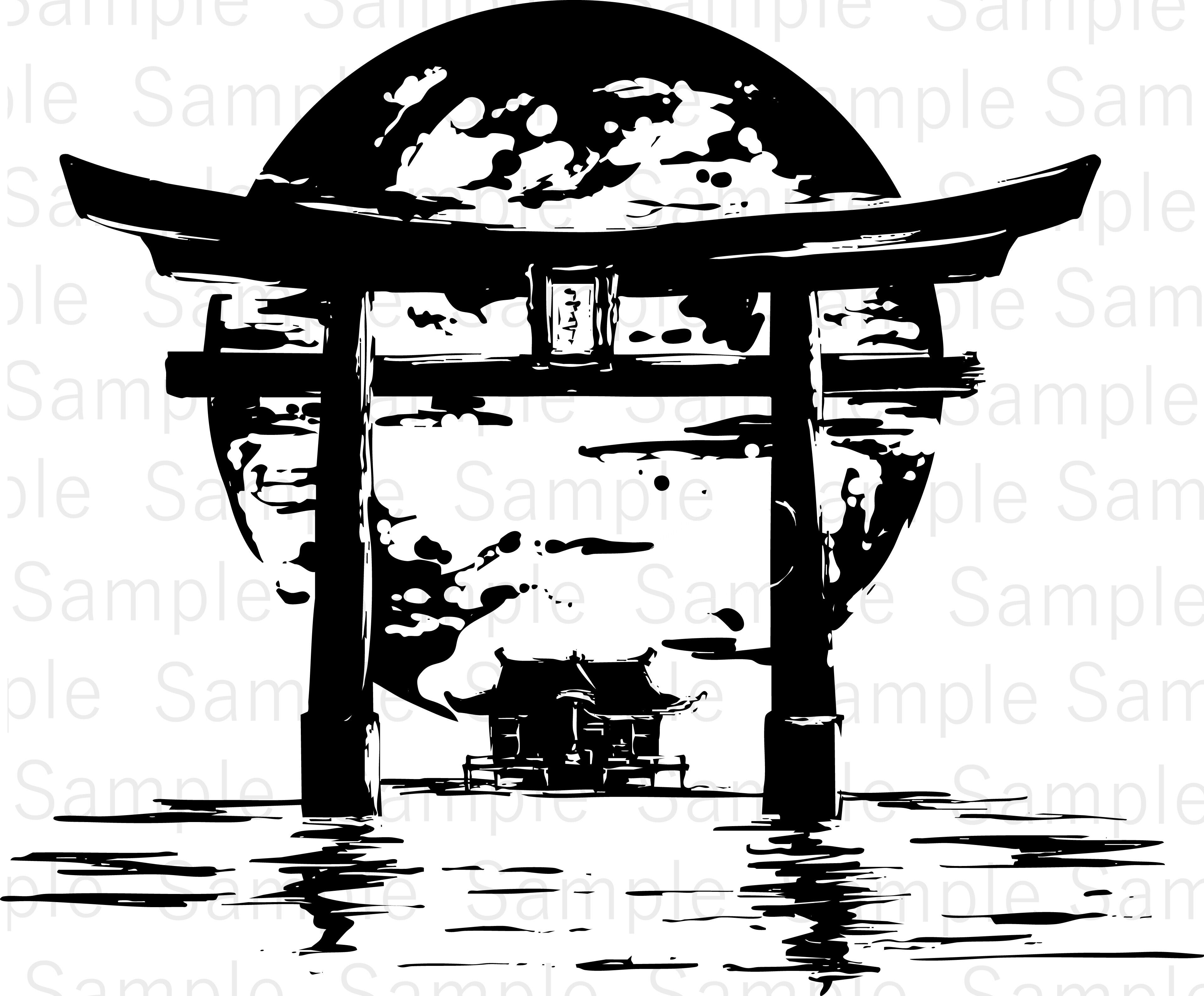 Tags: sumi-e, ink painting, torii, shrine, full moon, spirituality, Japanese style, sacred, tradition, design material