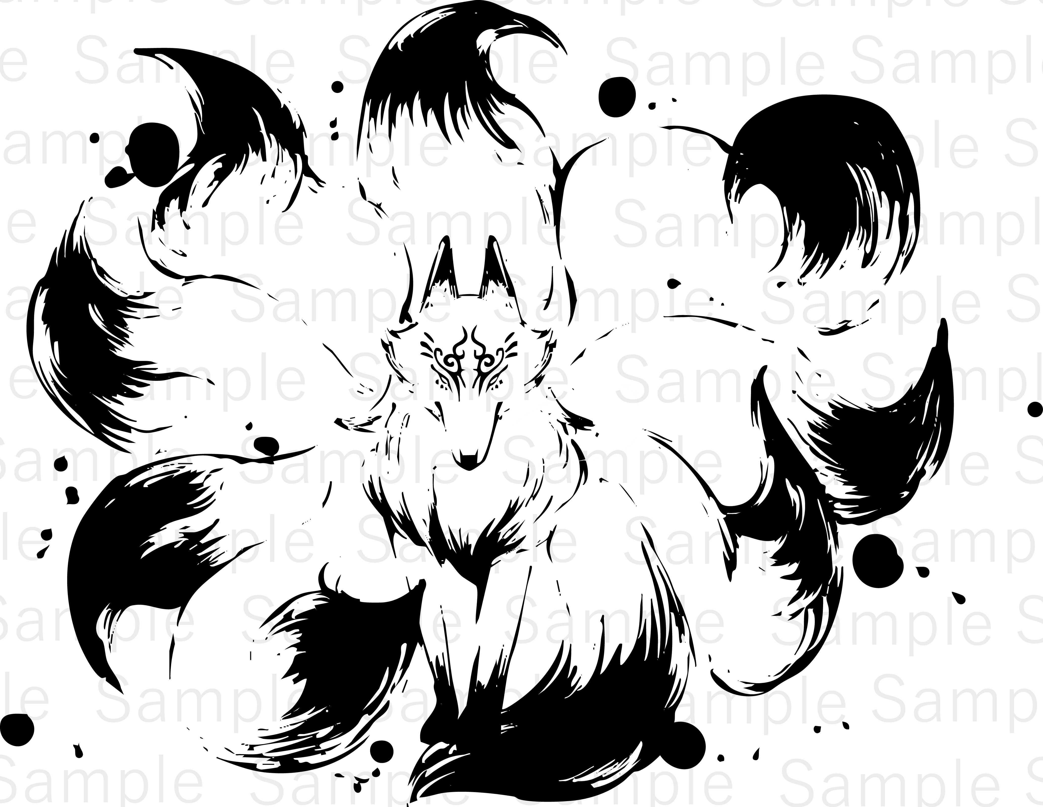 Tags: sumi-e, ink painting, nine-tailed fox, kyūbi, yokai, spirit beast, mythology, Japanese style, transformation, design material