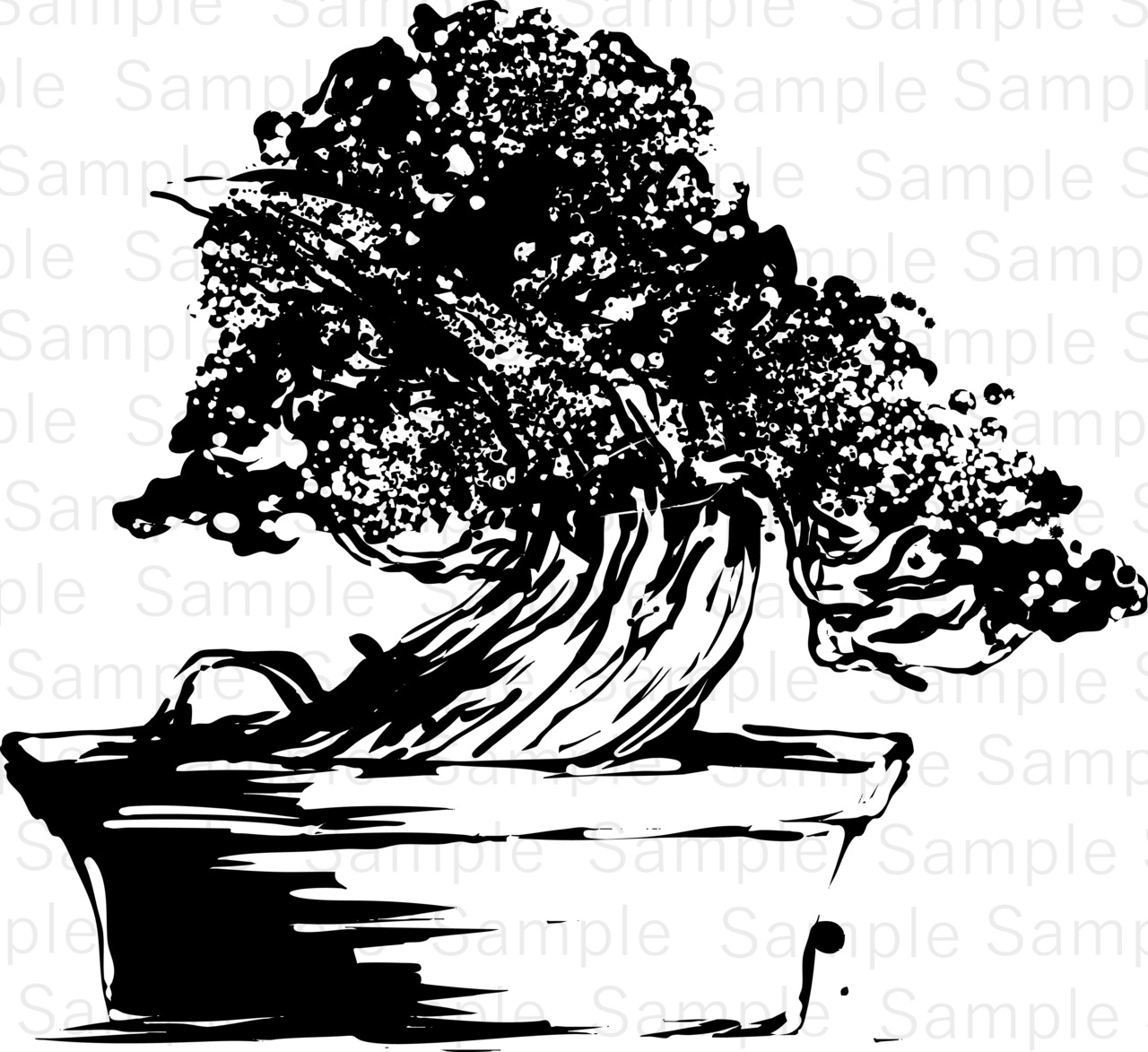 This sumi-e style illustration features a bonsai tree rendered in delicate brushwork and subtle ink tones.