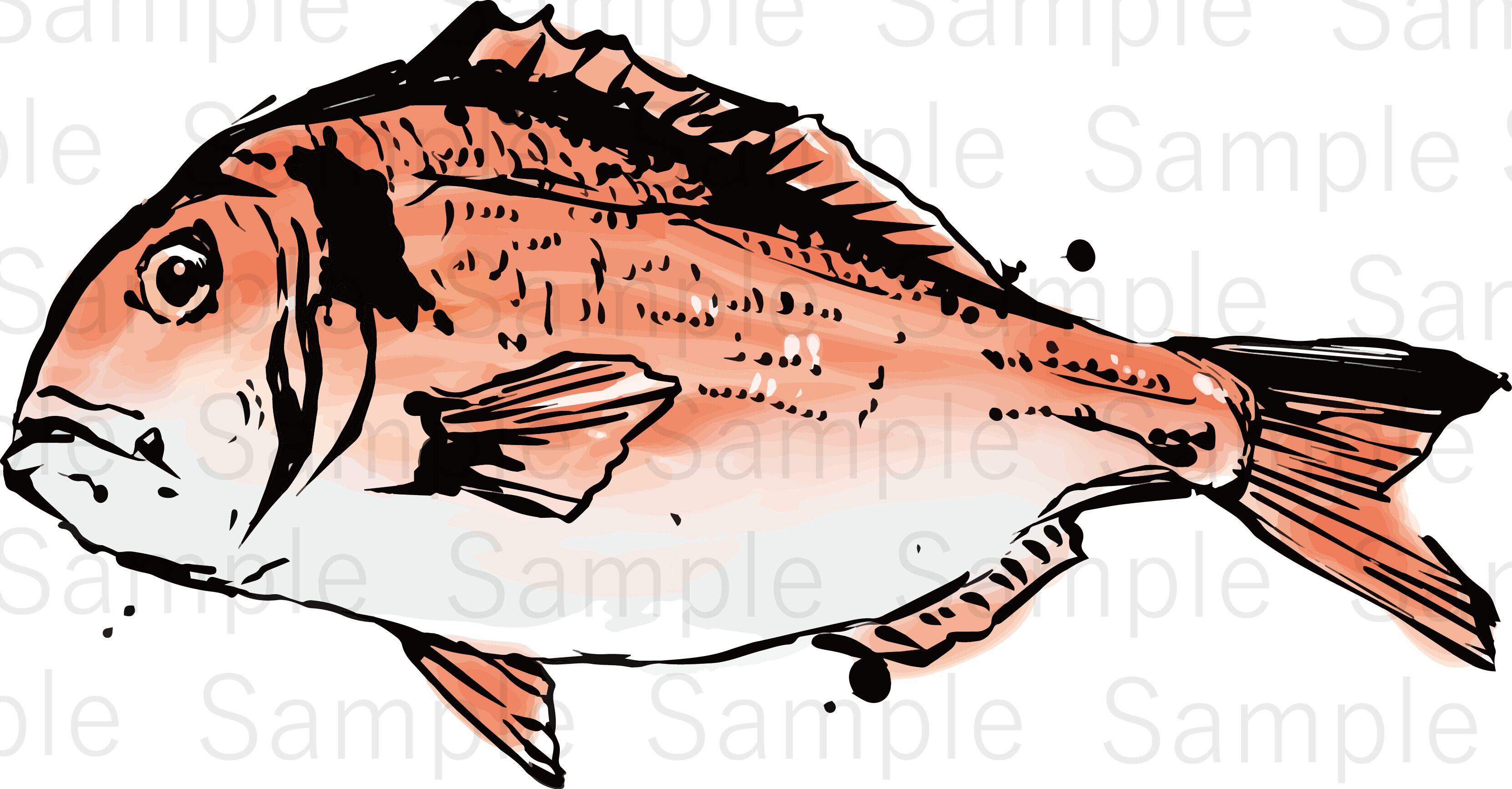 This illustration set features a sea bream (tai) in a fish-print style, offered in both sumi-e (black and white) and color versions.