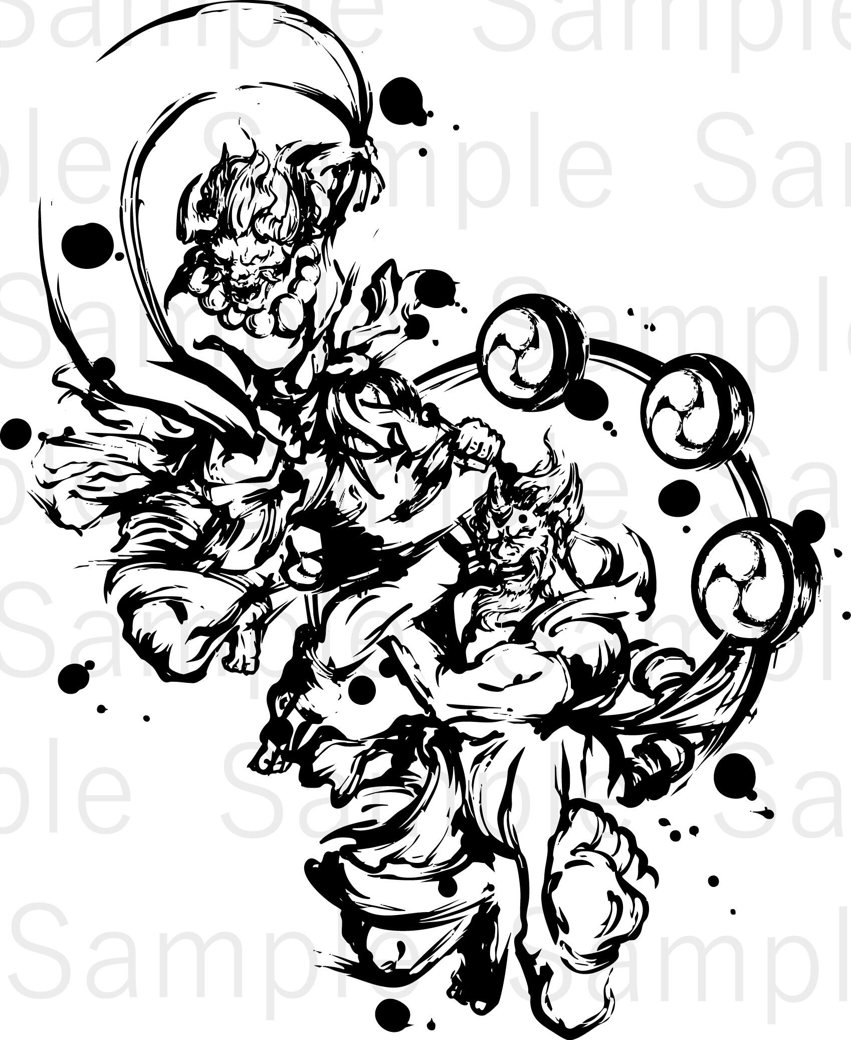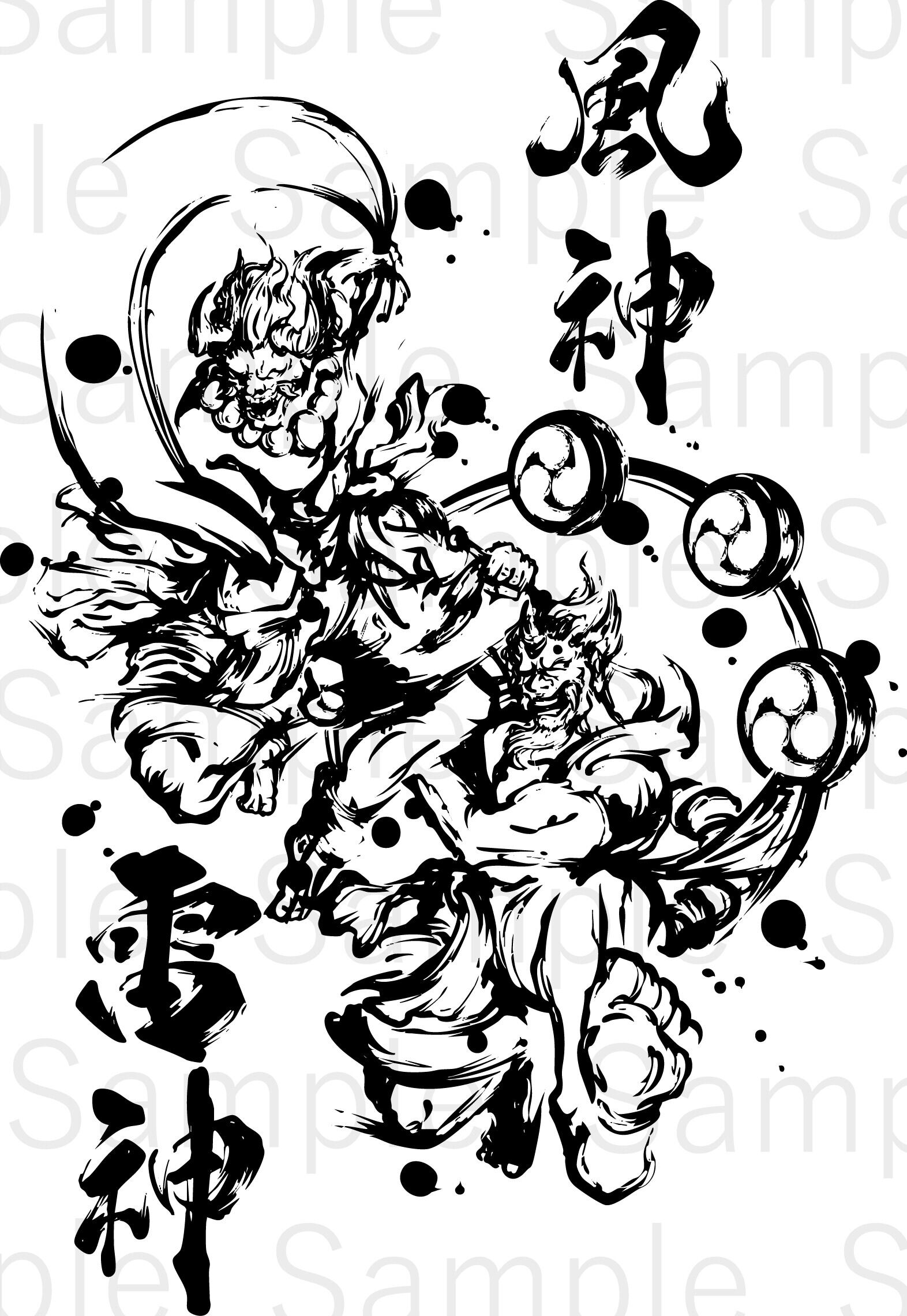 Tags: sumi-e, wind god, thunder god, Fūjin, Raijin, mythology, Japanese style, brushwork, PNG, JPG, AI, illustration material