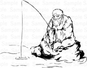 This sumi-e style illustration features an elder in traditional kimono fishing, rendered in tranquil brushwork.