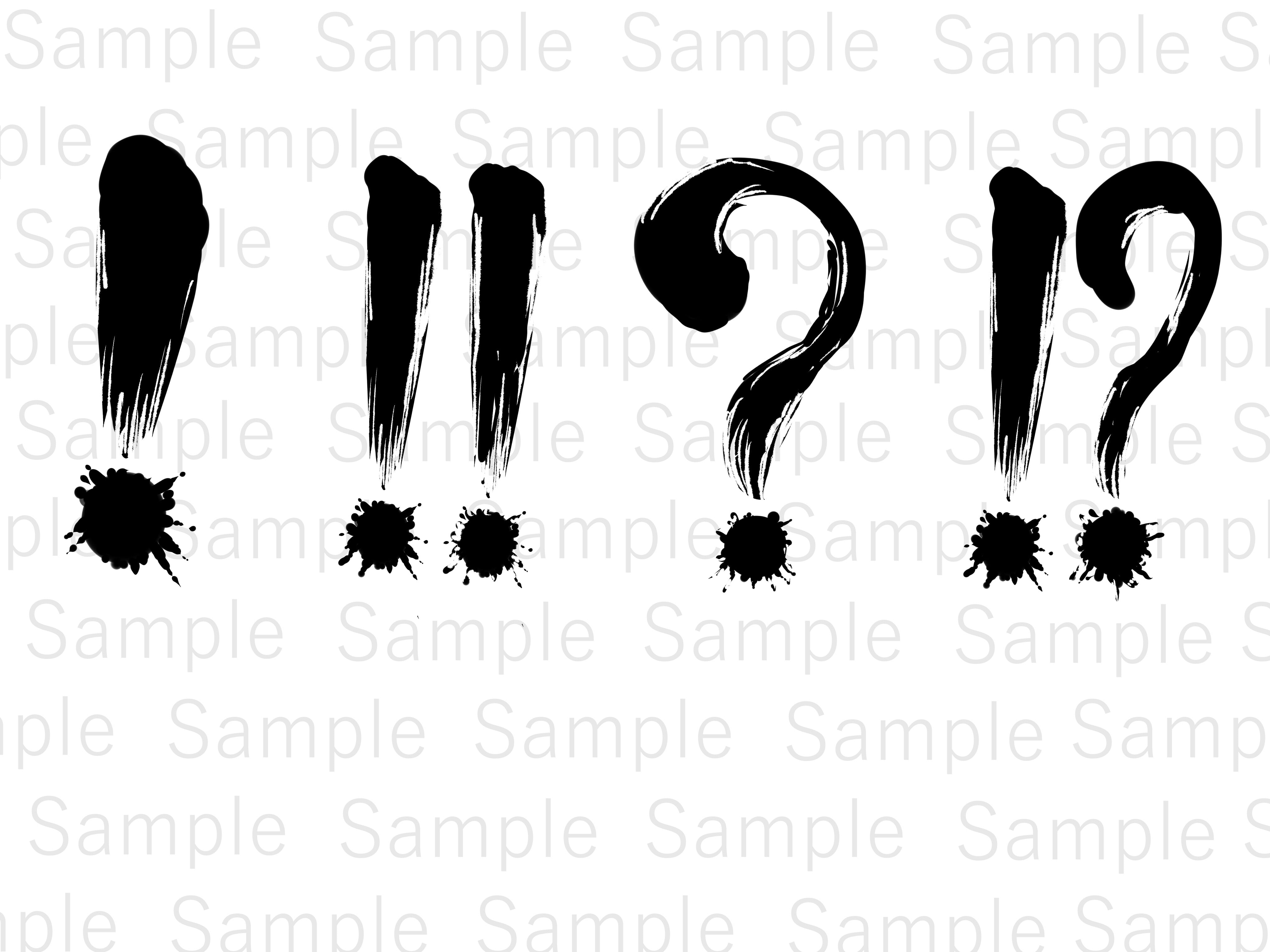 墨の筆致を活かして描かれた「!」「‼」「?」「⁉」の筆文字イラスト素材セットです。