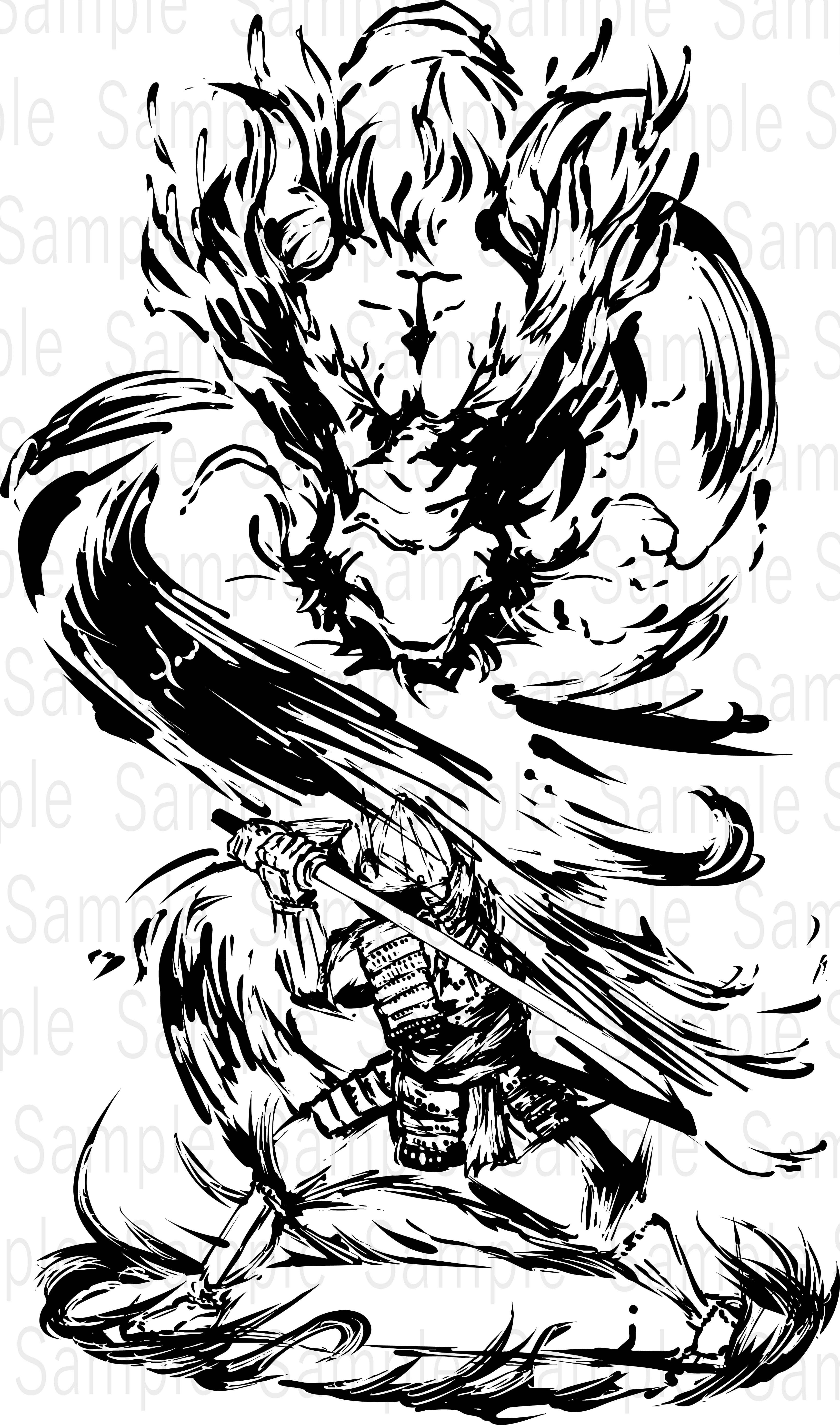 本作では、侍の凛とした佇まいと、龍の躍動感あふれる姿を、墨の濃淡と力強い筆致で表現し、「武士の精神」「霊力」「威厳」「神秘性」を象徴する構図に仕上げています。