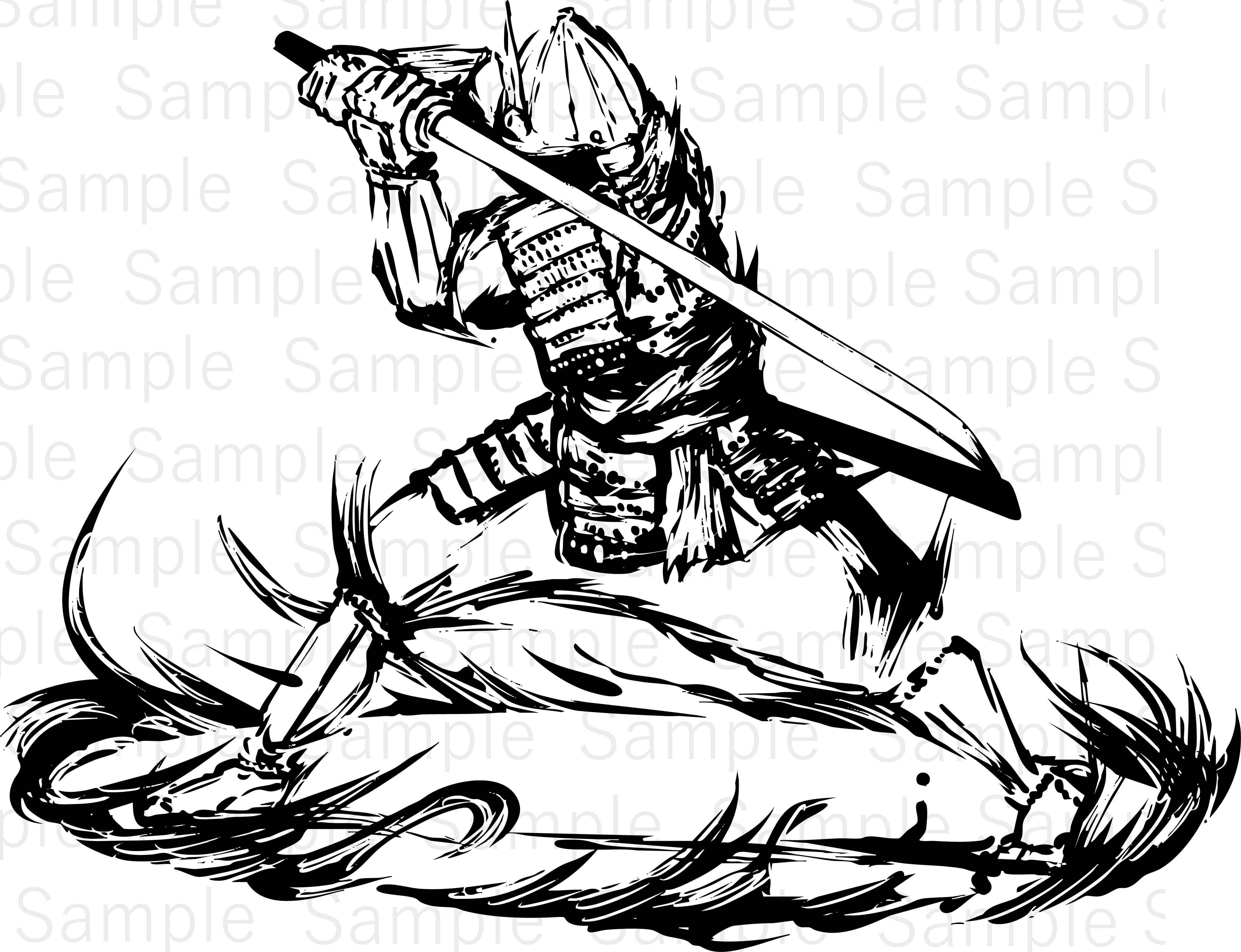 墨の筆致を活かして描かれた、刀を抜いて構える侍をモチーフにした墨絵イラスト素材です。